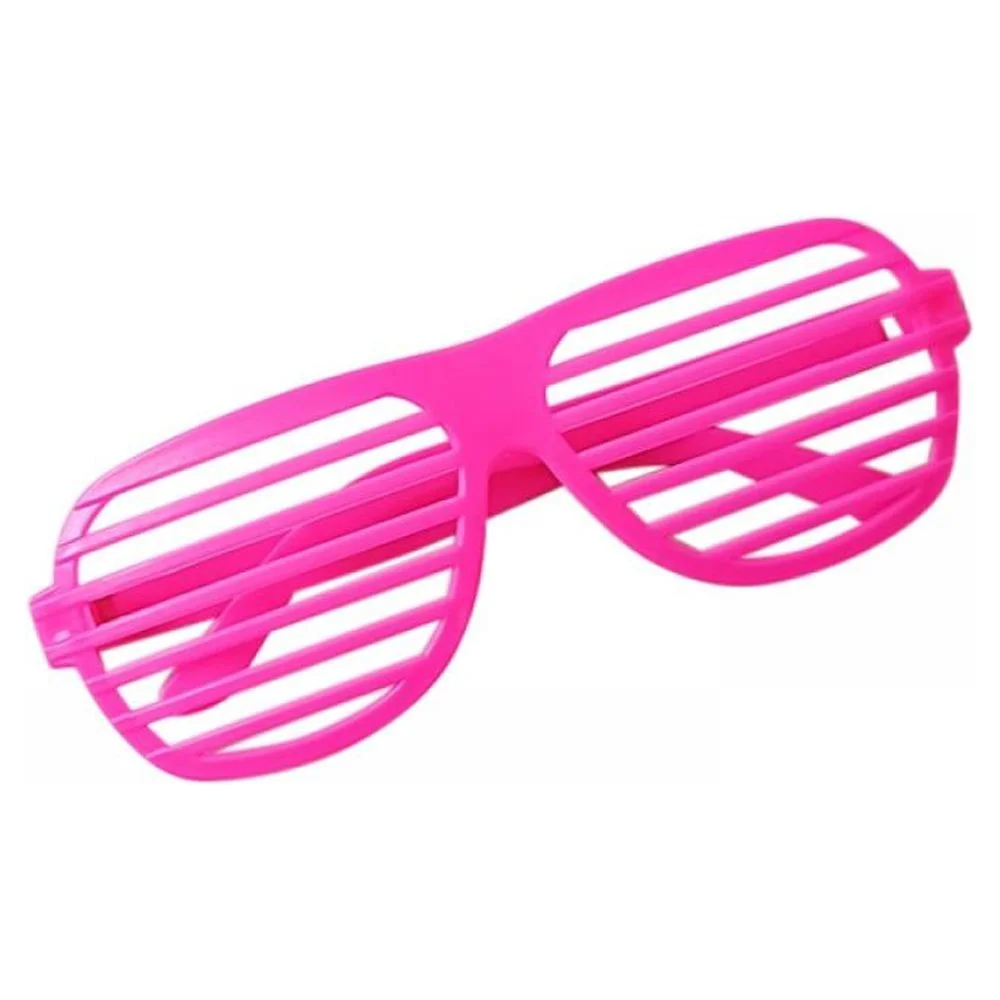 Neon pink shutter-style glasses feature horizontal slats across the lenses, offering a bold, futuristic look. Perfect for festivals, parties, for adding a fun touch to your outfit, these glasses make a vibrant statement with their eye-catching color.