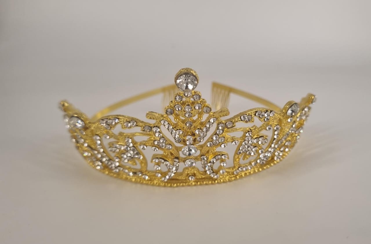 Step into a world of royalty with our Gold Metal Princess Tiara, beautifully crafted from premium gold-tone metal and adorned with sparkling diamantes that radiate elegance and charm. This tiara blends the warmth of gold with the brilliance of diamonds, making it the perfect accessory for any pageant, wedding, or princess-themed event. Whether you’re a queen for the day or shining on stage, this tiara will ensure you feel like royalty.