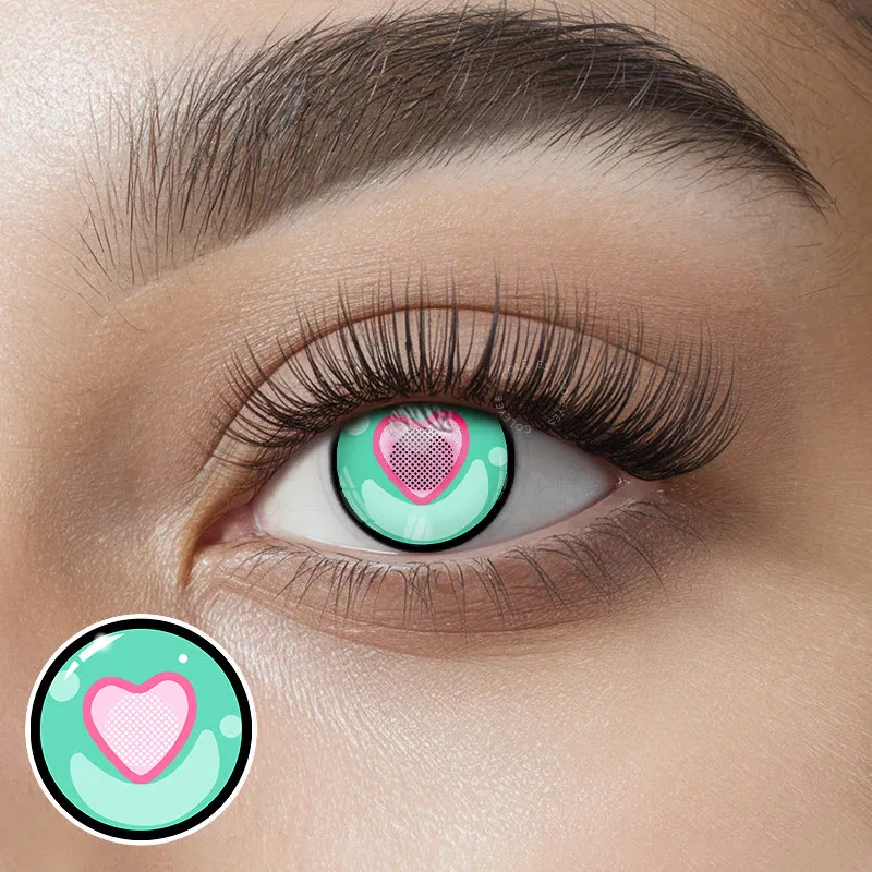 feature a vibrant green background with a delicate pink heart at the center for as part of the pattern. These lenses create a playful and unique look, combining bold color with a touch of sweetness. Perfect for cosplay, costume parties, for adding a fun and whimsical element to your appearance, these lenses are designed to make your eyes stand out with charm and flair.