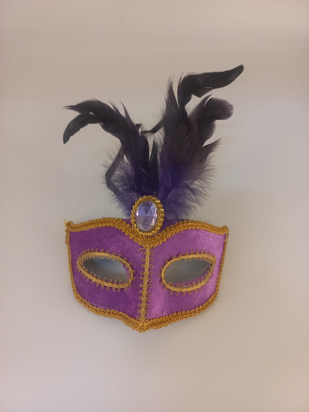 A purple design with gold trim and feathers blends regal sophistication with opulence, featuring rich purple fabric accented by golden details and delicate feathers for a luxurious and dramatic appearance.