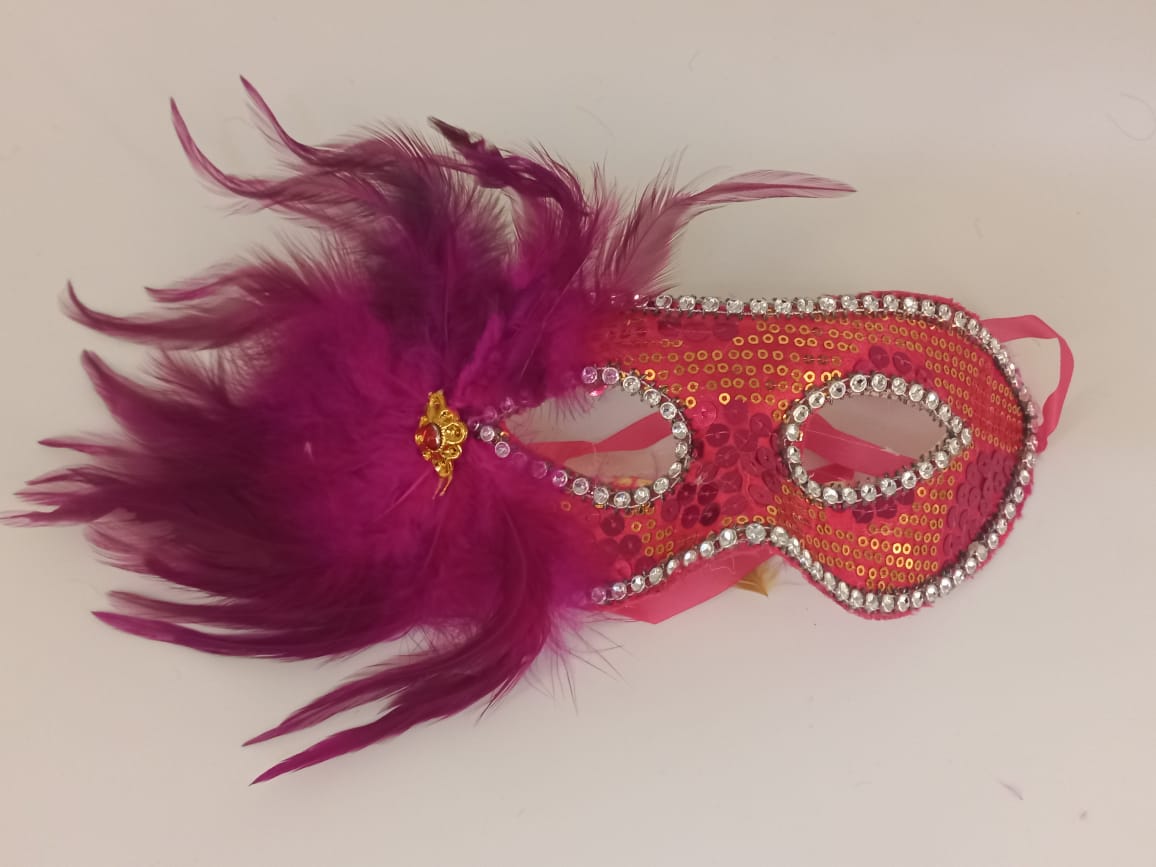 A bold red mask featuring a striking purple feather detail, creating a captivating contrast of vibrant colors for a dramatic and elegant look.