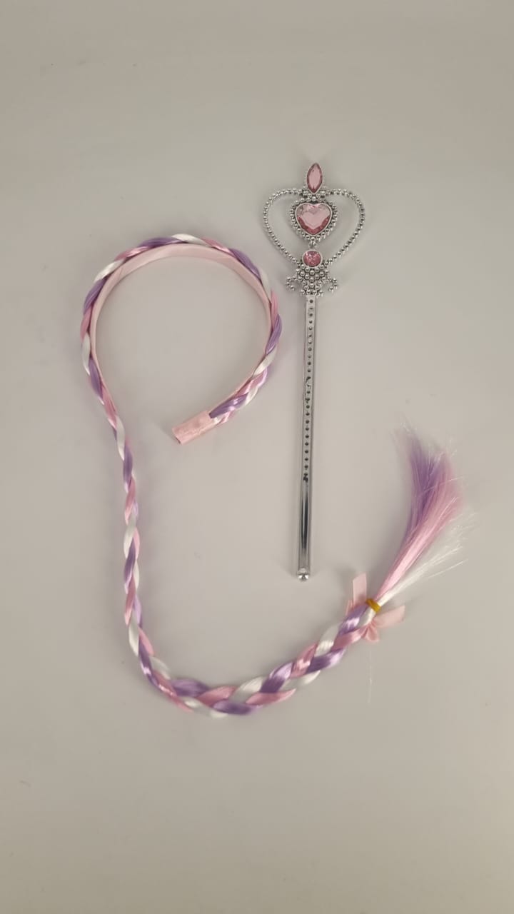 A Rapunzel Alice band featuring a purple, white, and pink plate, and comes with a wand to complete the magical look. This enchanting accessory is perfect for bringing a fairy tale vibe to costume parties, themed events, or any Rapunzel-inspired outfit. The wand adds a whimsical touch to enhance your magical appearance.