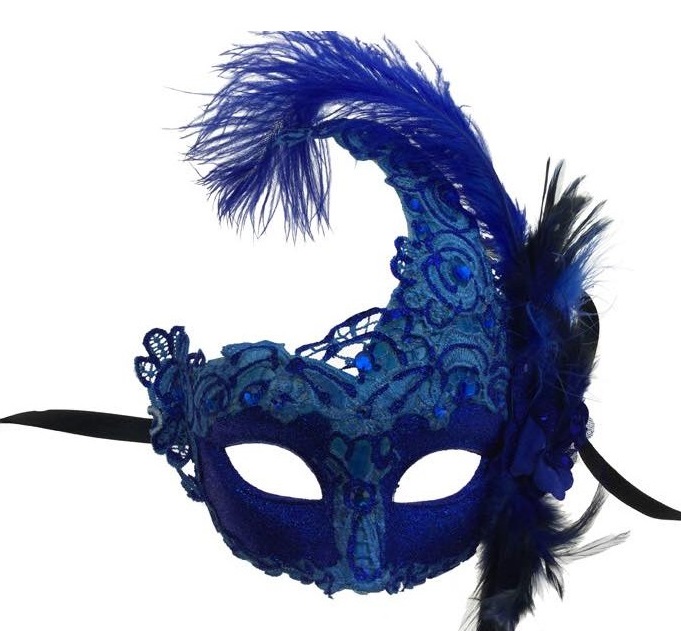A striking royal blue mask accented with a soft, elegant feather detail, adding a touch of regality and flair