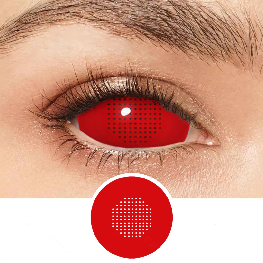 Red Mesh Contact Lenses feature a bold, full red design with a mesh pattern that covers your iris while still allowing limited vision. These eerie and intense lenses create a haunting, otherworldly effect, making them perfect for cosplay, Halloween, horror characters, or making a bold statement at special events. Designed to give your eyes a sinister and mysterious appearance, they are ideal for those who want to achieve a striking and unforgettable look.