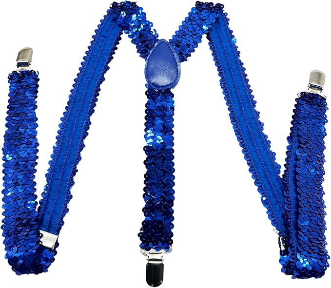 With adjustable straps for a personalized fit and sturdy clips for effortless trouser attachment, these suspenders combine practicality with radiant, eye-catching style. Whether you’re dressing up for a special occasion or making your everyday attire stand out, these royal blue sequin suspenders are sure to shine.