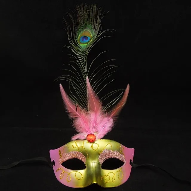 A radiant shine pink mask adorned with gold accents and a delicate feather detail, blending vibrant color with luxurious elegance.