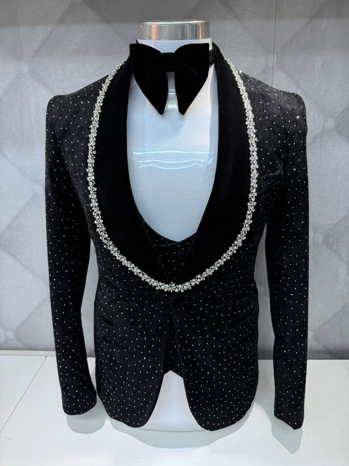 Step into timeless sophistication with this three-piece black tuxedo, elevated by luxurious detailing fit for any show-stopping entrance. The jacket features a pearl-trimmed lapel that adds an elegant, luminous touch, perfectly balancing boldness with refinement. Subtle glitter embellishments cascade across the jacket’s fabric, catching the light with every movement for a sleek, modern sparkle that never feels overpowering.