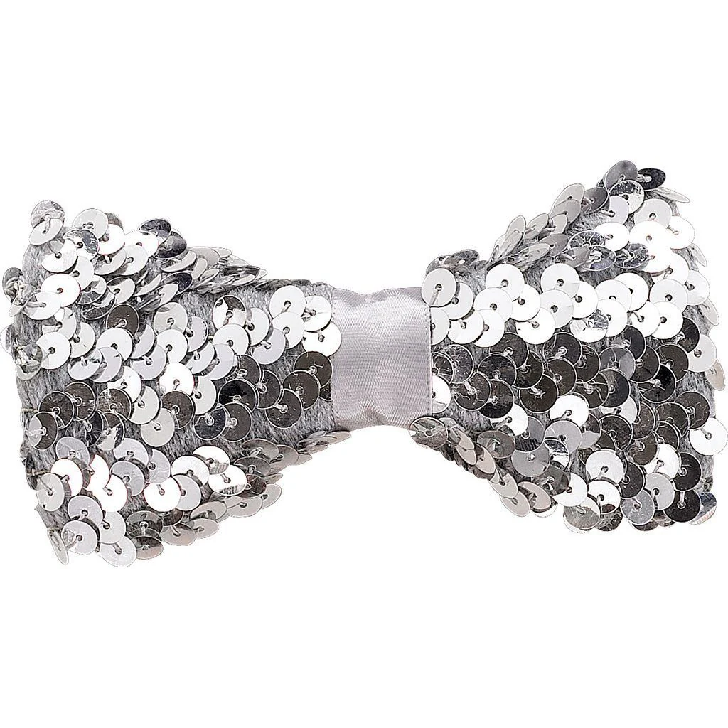 A silver sequin BOW TIE is a sleek and sophisticated accessory, featuring a shiny silver hue with reflective sequins that catch the light beautifully. Ideal for formal events for celebrations, it adds a touch of modern elegance and sparkle, making it a versatile statement piece for a variety of outfits.