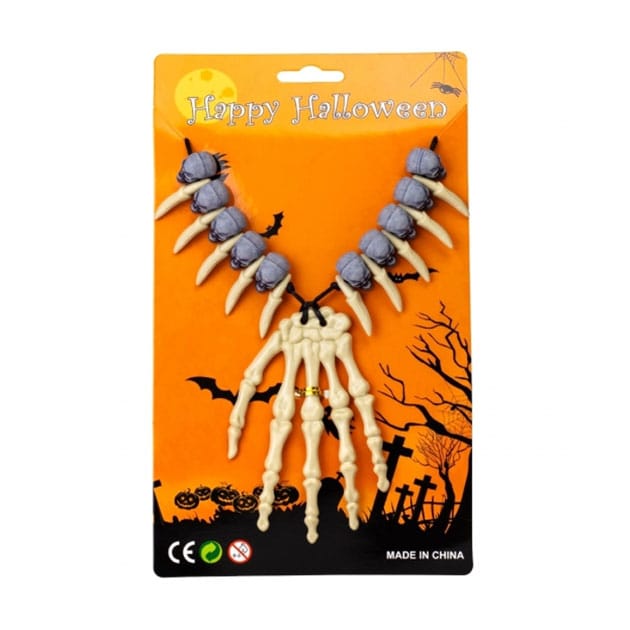 This edgy necklace features a black string with a small, gray skull at it’s center, accompanied by teeth bones for a bold, gothic look. The skull is detailed and complemented by a bone hand charm, adding a unique and rebellious touch. The combination of the skull, bones, and hand gives this necklace a spooky, rock-inspired vibe. Perfect for Halloween, punk fashion, for anyone looking to add a dark, alternative accessory to their outfit, this necklace is sure to make a statement.