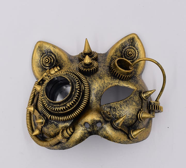 A bold and striking gold steampunk cat mask, designed to captivate attention with its intricate detailing. Crafted from durable material, this mask features a gleaming metallic gold finish, complemented by sharp, edgy spikes adorning the sides for an added element of danger. Delicate gears and mechanical elements are carefully placed across the mask, enhancing the steampunk aesthetic. With an elegant cat-like silhouette, the mask offers a mysterious, yet fierce look, perfect for those who want to stand out at costume events or cosplay gatherings. It balances futuristic elements with vintage charm, offering a unique accessory to complete your steampunk look.