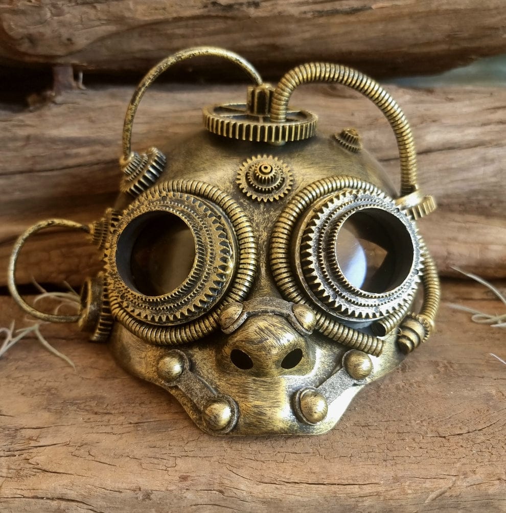 This gold vintage robot mask combines the elegance of steampunk with the futuristic allure of robotics. Crafted from high-quality materials, the mask boasts a gleaming gold finish that exudes a sense of retro-futuristic style. Intricate mechanical gears, cogs, and rivet details adorn the mask, giving it a meticulously designed, industrial look. The eyes feature a glowing, metallic effect, enhancing the robotic vibe. Its vintage robot design evokes the charm of a bygone mechanical age, while the steampunk influences lend it a timeless, adventurous appeal. Perfect for steampunk enthusiasts, cosplay, or themed events, this mask is sure to make a bold statement.