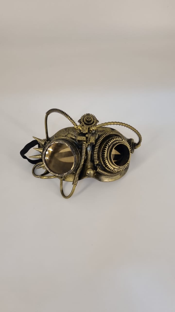 Step into a world of retro-futuristic style with this gold Steampunk goggle mask, featuring detailed goggles and intricate gear accents. Perfect for cosplay, Halloween, or steampunk-themed events, this mask combines vintage charm with a bold, metallic touch. Durable, eye-catching, and full of steampunk flair!
