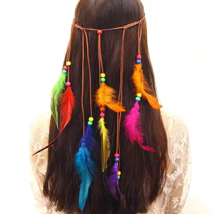 60s-inspired Native American-style headband with a braided light brown rope, green beads, and vibrant assorted feathers for a retro boho vibe.