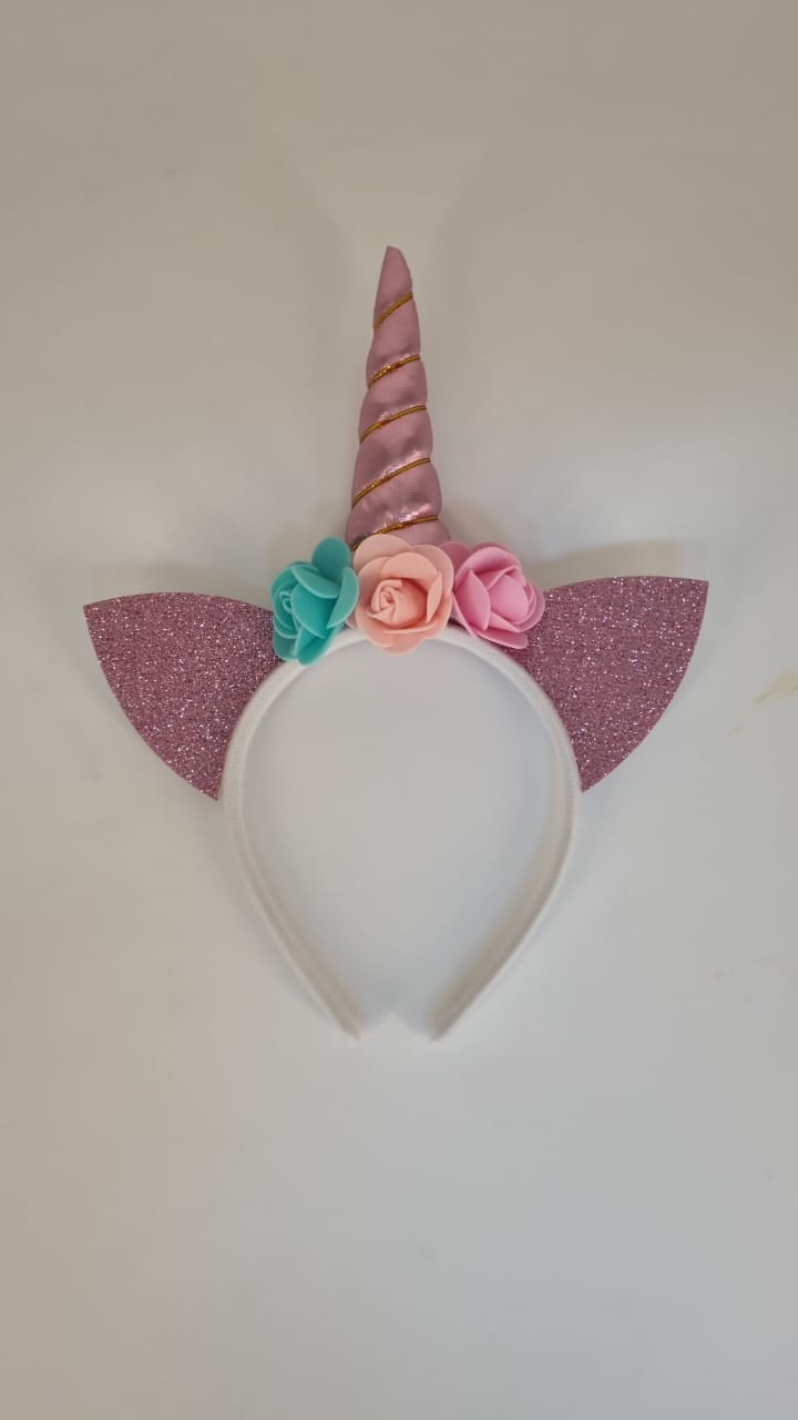 Pink unicorn horn Alice band with glitter pink ears and a vibrant red, pink, and white flower accent. A whimsical accessory for any magical look!