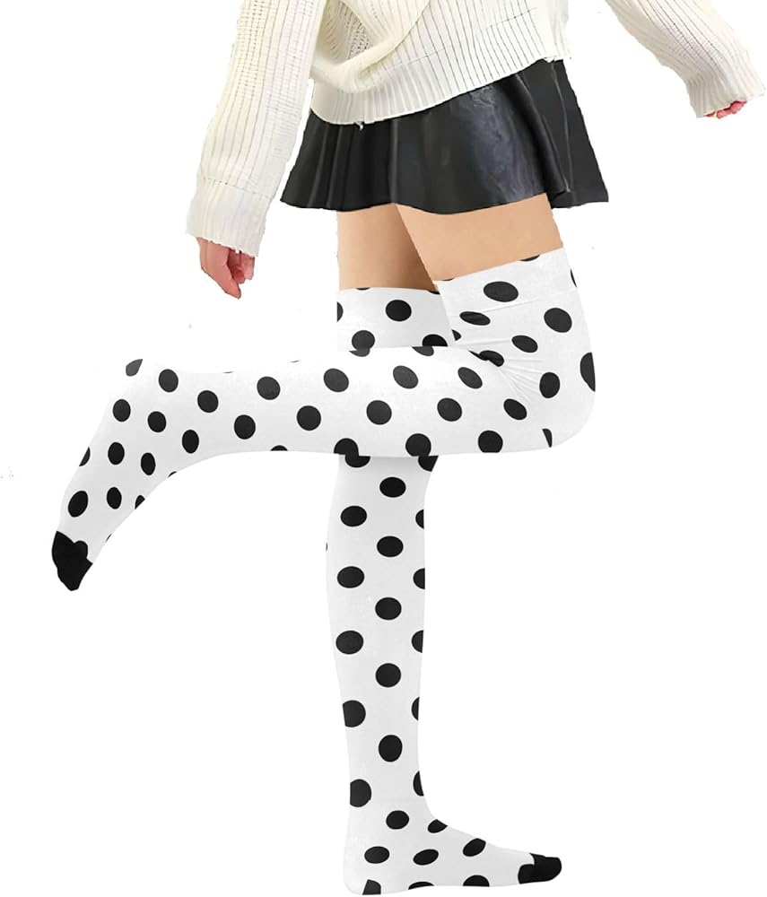 White knee-high socks with black dots create a charming, retro-inspired look. The bold contrast between the white background and black dots adds a playful touch, making them a stylish and fun accessory. These socks are perfect for adding personality to casual outfits for complementing a more whimsical, vintage style.