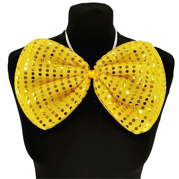 A Large Sequin BOW TIE in yellow, designed to add a bold and eye-catching touch to any outfit. The BOW TIE features sparkling sequins that catch the light, creating a fun and festive look. Perfect for parties, formal events, for costume wear, this vibrant yellow BOW TIE adds a pop of color and a playful flair to your ensemble.